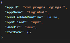 Luego nos piden el nombre del paquete de Android o dominio, esto lo podemos encontrar en el archivo config.xml este nombre lo podemos cambiar, yo lo tengo como io.ionic.starter y lo cambiaré a com.pragma.logingaf de igual forma pondré en el name el nombre de mi aplicación para que quede de la siguiente manera.
