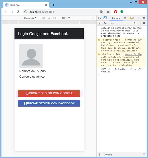 Ahora corremos nuestro proyecto Ionic e intentemos iniciar sesión con Google, se nos pedirá la cuenta con la que queremos iniciar sesión y luego nos imprimirá por consola todo los datos obtenidos del usuario además de los datos que pintamos en la app, como podemos ver en la siguiente imagen.