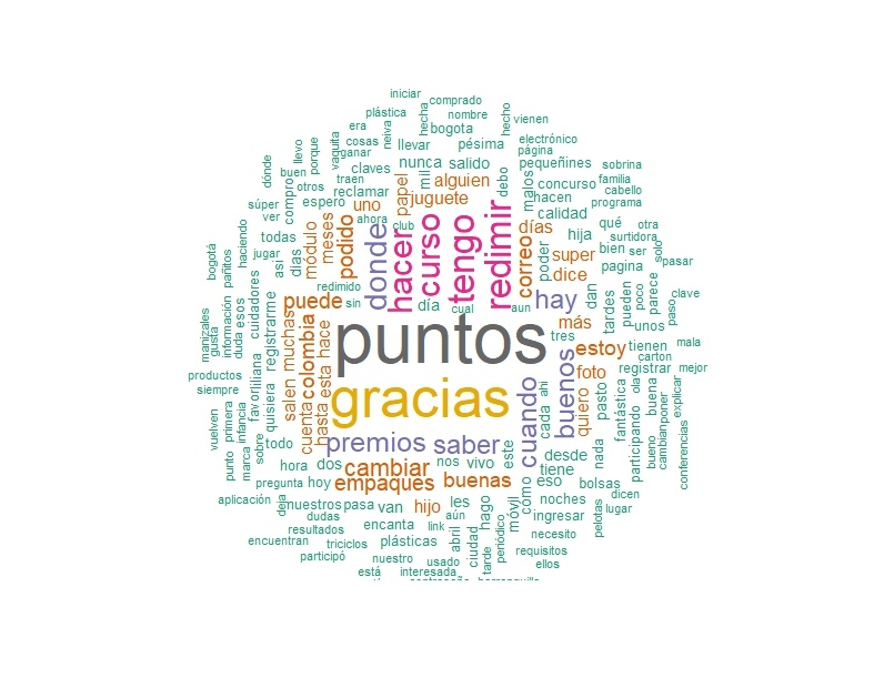El siguiente es un ejemplo de una nube de palabra de los comentarios en una fan page, donde se observan palabras relevantes como “puntos”, “curso”, “hacer” y “redimir”, lo que indica que los usuarios preguntan frecuentemente sobre cómo redimir los puntos y cómo pueden hacer unos cursos ofrecidos.