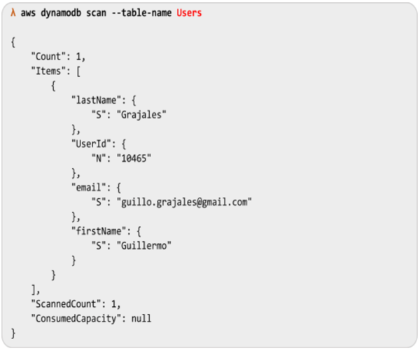 El resultado es un JSON con tres keys: Items, Count y ScannedCount. Items es un arreglo con los datos que tiene la tabla, y Count, un número que indica la cantidad de elementos que tiene la tabla.