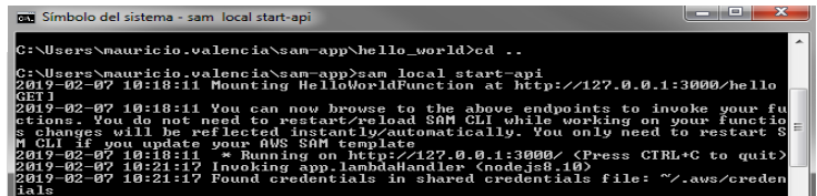 Volvemos a la carpeta sam-app y ejecutamos el comando sam local start-api para iniciar la función la cual correrá en un servidor local.
